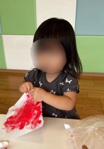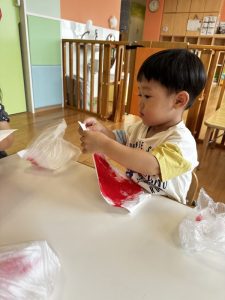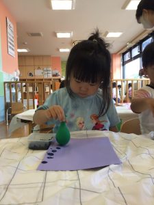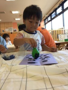 りんご組は小さな水風船に絵の具を付けて、丸を沢山描きました。