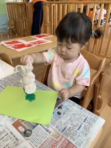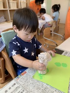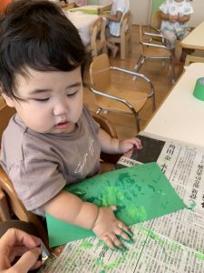 もも組は布や指で、緑色を色画用紙に付けていきました。