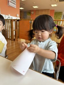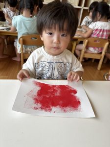 いちご組はスポンジで画用紙に色を付け、ビリビリと破りました。