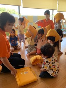 お昼寝をしていた、いちご組のお部屋で防災頭巾を被り『ダンゴムシ』になって揺れが収まるのを待ちます。