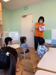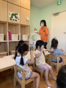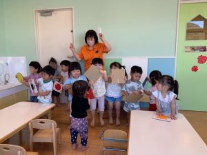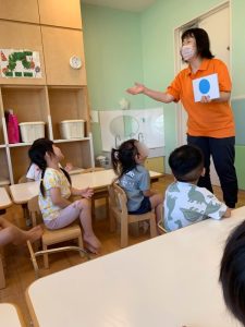その後は、みんなの良く知っている「果物」や「色」をカードで見ながら、名前を言っていきます。