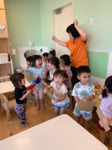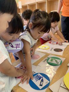 楽しく遊んだり歌ったりしている間に覚えたことが、遊びの中にも出てきて、ブロック遊びなどのふとした時にも「square!」とか「blue」等という声が聞こえてきたりしています😊