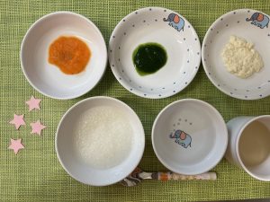 (写真は離乳食後期です。年齢によって形、固さ、盛り付け量を変えて、提供しています。)