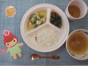 (写真は離乳食後期です。年齢によって形、固さ、盛り付け量を変えて、提供しています。)