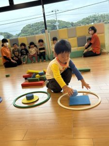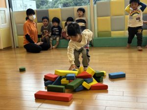 色や形の名前を確認したら、今度は積み木から「Blueのsquareはどこかな?」と言いながら探していきます。