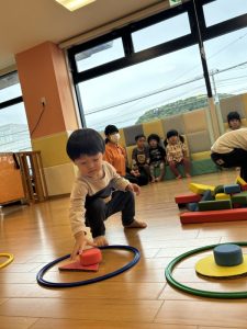 カードで色の名前を確認したり、手で形を作りながら「triangle!」等と形を表す英語を言ったりしています。