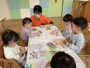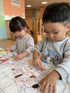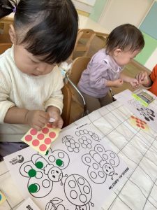 塗り絵の線を意識してシールを貼ったり、クレヨンで色をのせたりする姿が見られてきましたよ✨