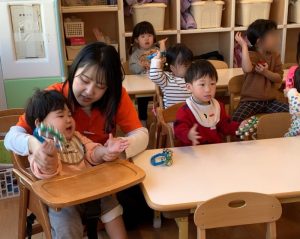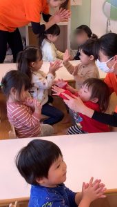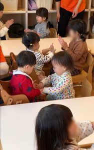 今、リトミックでは「トンパ・トンパ」のリズムで、楽器を叩いたり、お友だちと手を打ち合うことに取り組んでいます。