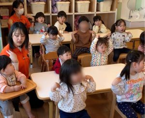 「ド・ミ・ソ」の音で「頭・頬・肩」を触るリズム遊びは、今までに何回も行っており、子どもたちも慣れてきた様子。