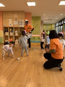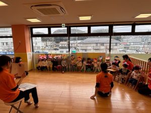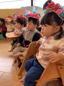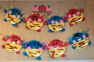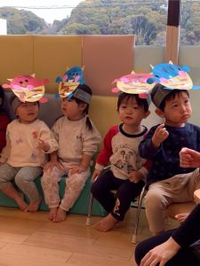 「まめまき」の歌を歌ったり、紙芝居にて「なぜ豆まきをするのか」のお話を聞きましたよ。