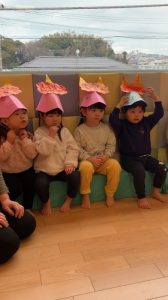節分会では、それぞれのクラスで制作したオニのお面を被って参加しました。