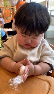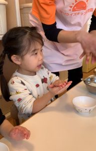 りんご組のお友だちは、最初はご飯が手にくっついちゃったけど、何個か作っているうちに丸いおにぎりになりましたよ!