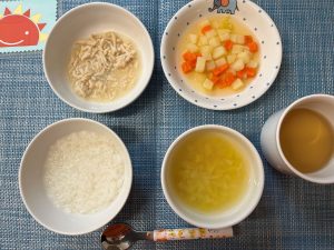 (写真は離乳食後期です。年齢によって形、固さ、盛り付け量を変えて、提供しています。)