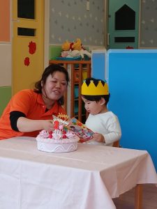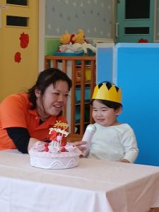お誕生児さんは、みんなの前でバースデーカードを受け取けとり、インタビューを受けました。