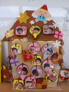 朝の会では、毎日お友だちの写真を1人ずつ裏返しにして、お菓子のお家を作っています。