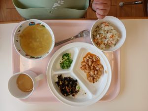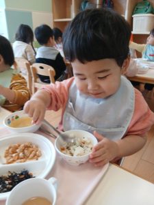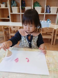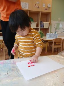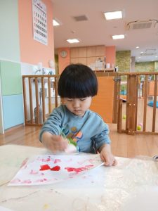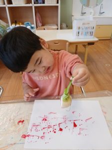 切った野菜の断面を不思議そうに触った後、好きな色の絵の具をつけてトントンとスタンプをしました。