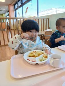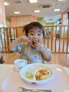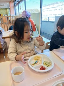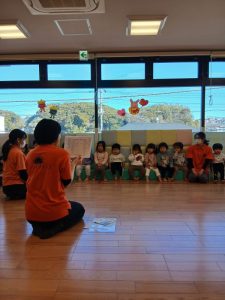 最後に「年の数だけ豆を食べると元気な身体になるんだよ」と伝えると、「3歳」と教えてくれるお友だち。「じゃあお豆3個だね」等とお話しました。