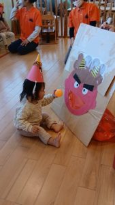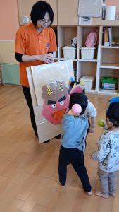 みんなで「鬼はそと~!福はうち~!」と掛け声の練習をすると……さっそく鬼の的に向け、豆に見立てたボール投げを行いました。