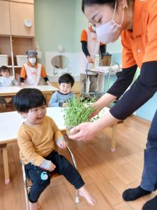 柔らかな葉っぱを触ったり、匂いを嗅いだりして、豆苗を感じていました。