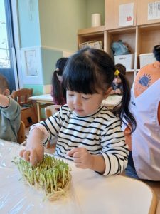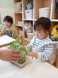 柔らかな葉っぱを触ったり、匂いを嗅いだりして、豆苗を感じていました。