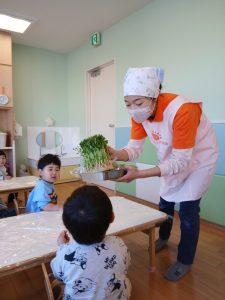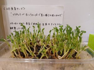 食育活動の一環で、豆苗に触れました。
