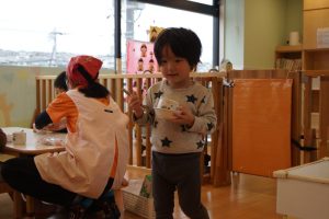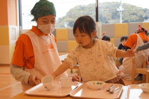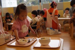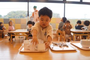 食べ終わった食器を落とさないようにそっと持って歩くお友だち。