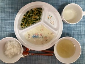 (写真は離乳食後期です。年齢によって形、固さ、盛り付け量を変えて、提供しています。)