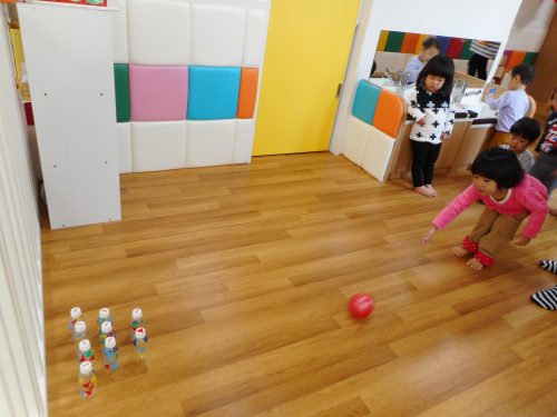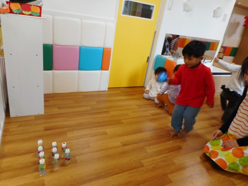 R-1の空き容器にみんなでビニールテープ貼ってボーリングのピンを