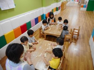小麦粉粘土をやりました。 みんな、目を輝かせて「おだんご!」「へびさん!」など言いながら 真剣に集中...