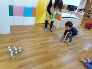 R-1の空き容器にみんなでビニールテープ貼ってボーリングのピンを 作りました。 ピンを立ててボーリン...