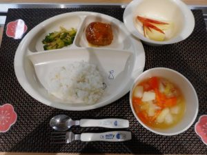 ・ご飯 煮込みハンバーグ ・ブロッコリーのごまあえ ・コンソメスープ ・りんご