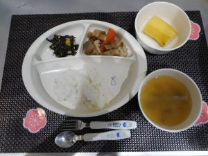 ・ご飯 ・高野豆腐の卵とじ ・さつま芋のみそ汁 ・すみそあえ ・りんご