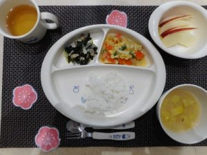 ・ご飯 ・豆腐の五目煮 ・ほうれん草の和え物 ・なめこのみそ汁 ・りんご