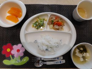 。二色ご飯 ・みそけんちん汁 ・青菜炒め ・デコポン ※ 離乳食も乳児食と一緒です。 食材は少し細か...