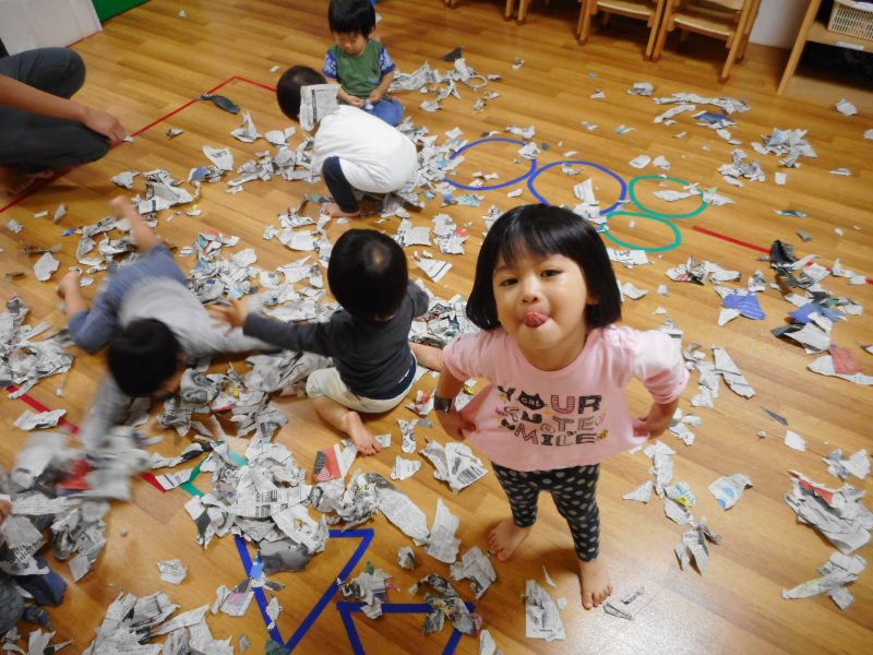 集めた新聞を投げてみたり、新聞紙の中に埋もれてみたり。