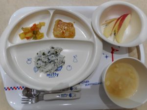 ・わかめご飯 ・煮魚 ・じゃがいもの炒め煮 ・大根のみそ汁 ・りんご
