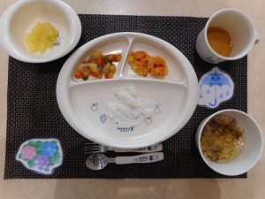 ・ご飯 ・ツナとじゃがいもの煮物 ・ささみのピカタ ・もずくのスープ ・パイン缶 ※0歳児にはパイン...