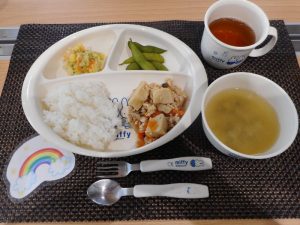 ・ご飯 ・高野豆腐のそぼろ煮 ・ポテトコーンサラダ ・わかめのみそ汁 ・枝まめ