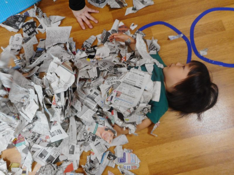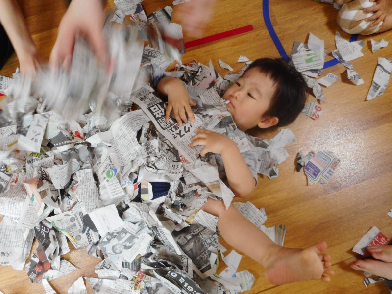 破いた新聞紙に埋もれて楽しそうにしていますね。埋もれてかくれんぼをやったり、皆で集めて上に投げ「ゆきがふったー」等楽しく遊んでいました。