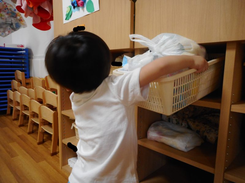 かごを自分でしまっているところです。少し自分達の背より高い位置ではあるのですが、頑張ってしまっていますね。