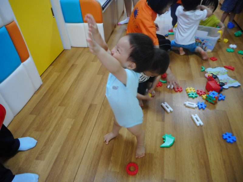 とってもかわいい笑顔ですね‼この笑顔を見たら、みんなやる気を出してあっという間に片づけられちゃいます。(この後先生と一緒に0歳児さんも上手にブロックを片付けてくれました)