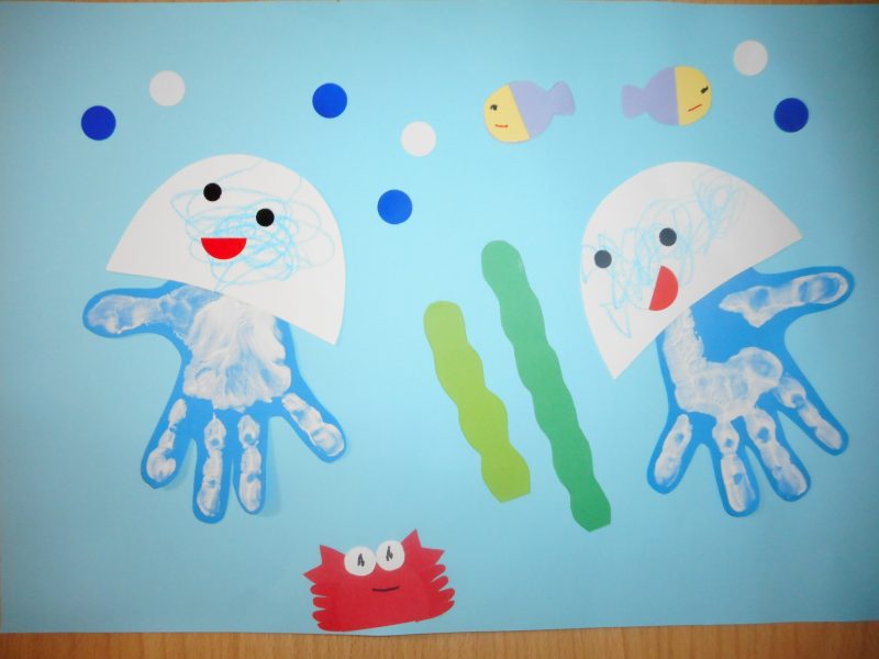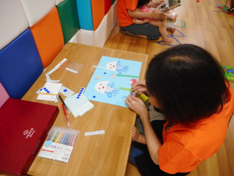 こちらが出来上がった作品です。可愛い海のお友だちです。こんな活動も楽しく参加できるようになりました。手に絵の具を付ける、貼る、描く。この4か月でとっても上手になりました。これも大きな成長ですね。