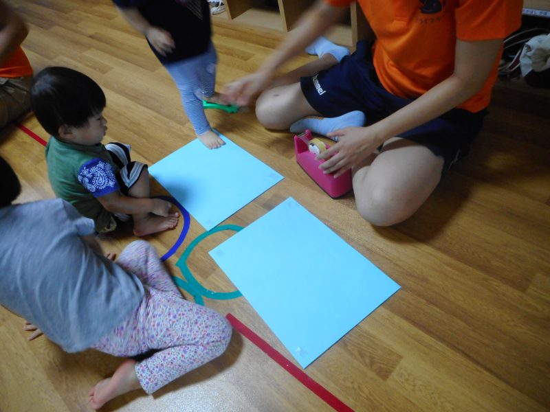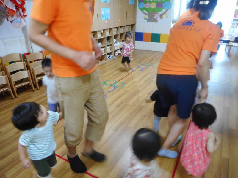 このような形で週2回リズム遊びを楽しんでいます。暑くてお散歩にはなかなか行けないですが、室内で体を動かして元気に過ごしています。身体を動かすのが大好き、とっても元気なサンライズキッズのみんなです。