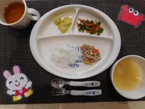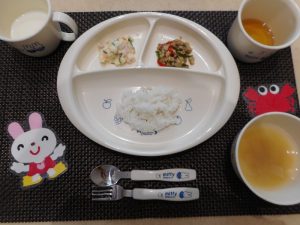 ・ご飯、チキンのハヤシシチュー、いんげんのサラダ、チーズ
