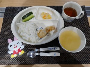 ・ご飯、みそ汁、鮭の和風ムニエル、きゅうりとキャベツのゆかり和え、ひじきの炒り煮。