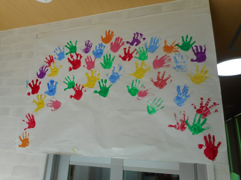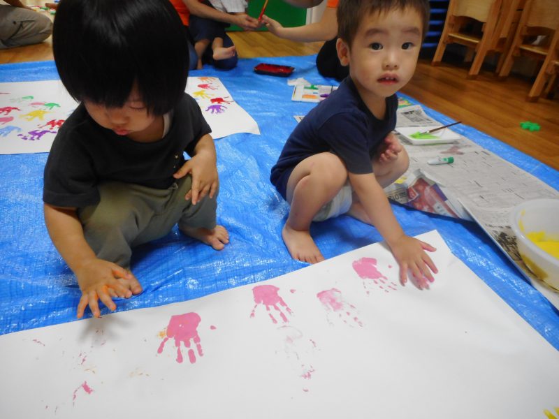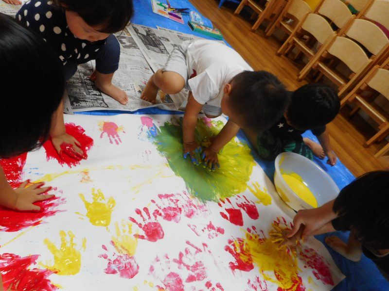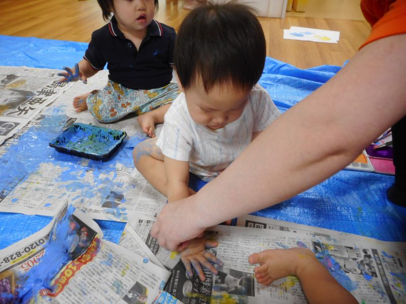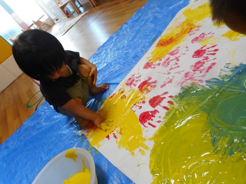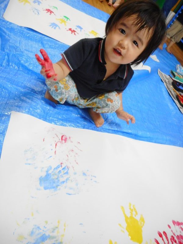 2歳さん絵具が付いた手をうれしそうに見せてくれました。楽しそうですね‼