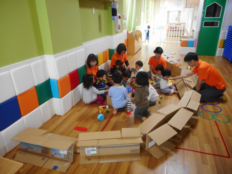 保育士が余っている段ボールでなんとなく周りを囲ってみると、そこからお家ごっこがスタートです開いているところは出入り口こっは台所こっちは遊ぶところ