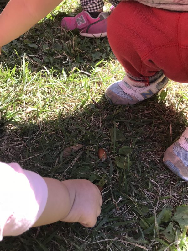 1歳さんはどんぐりを囲んで「これはなんだ」といった表情で見ていました