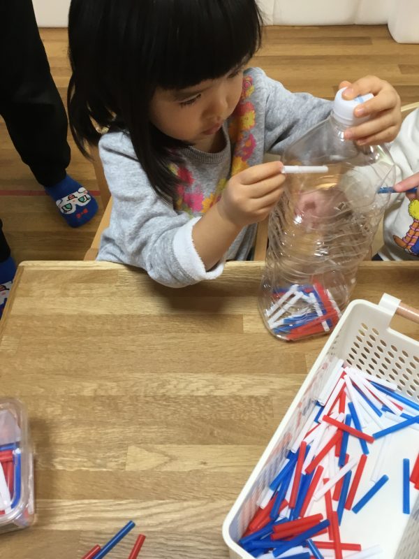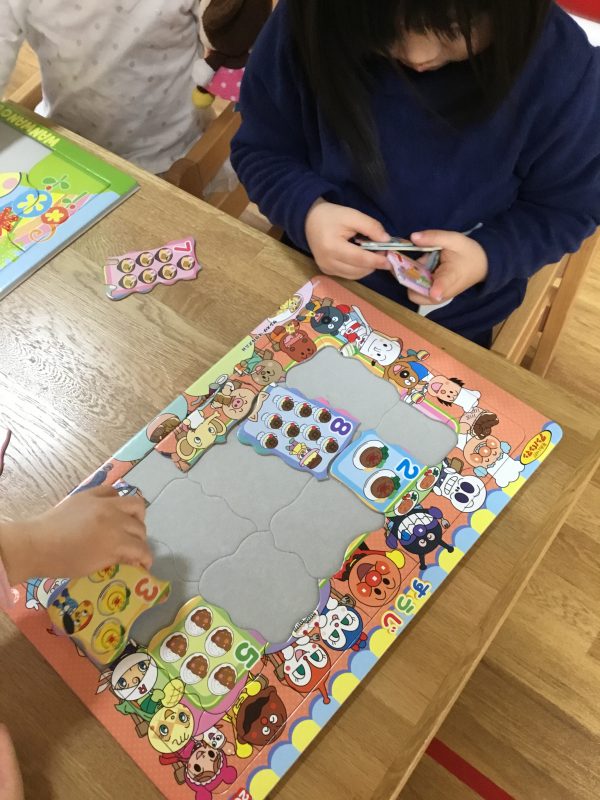 先程の工作もゆびさきを使いますが、「ひも通し」「ストロー通し」「パズル」なんかもゆびさきを使った遊びですよね![]()