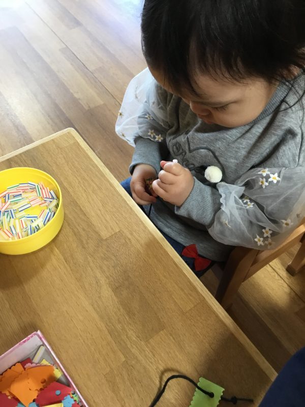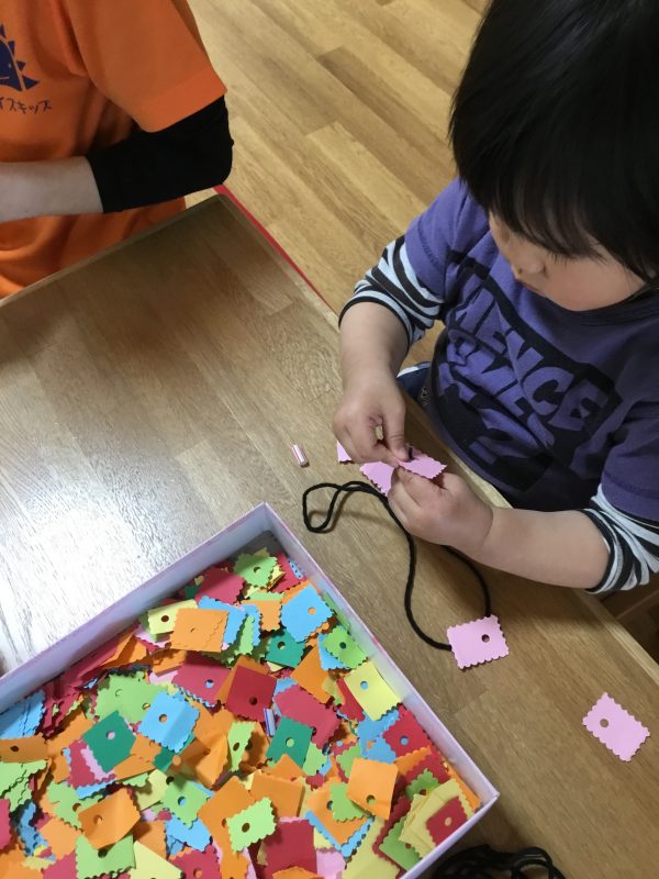 「ママにネックレスを作る」とひも通しに奮闘しています![]()
